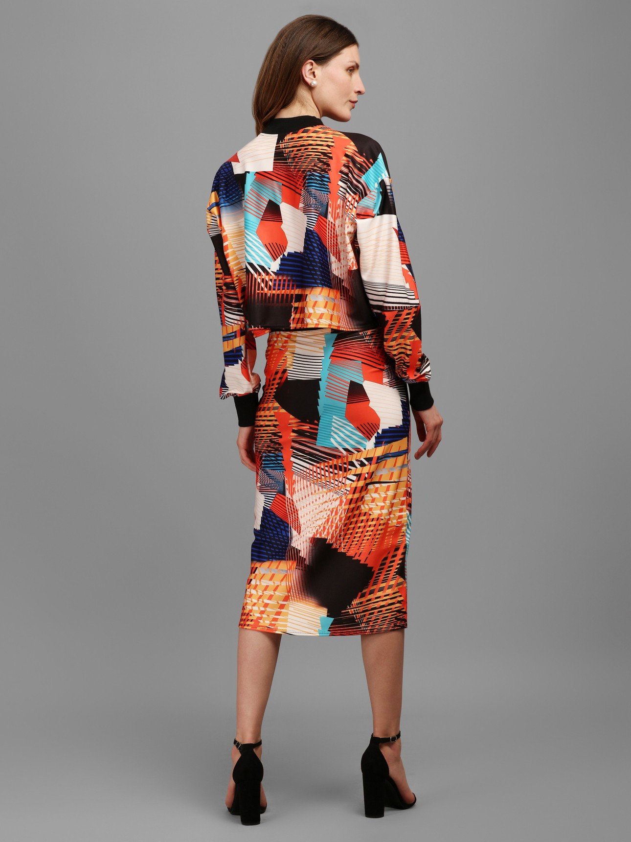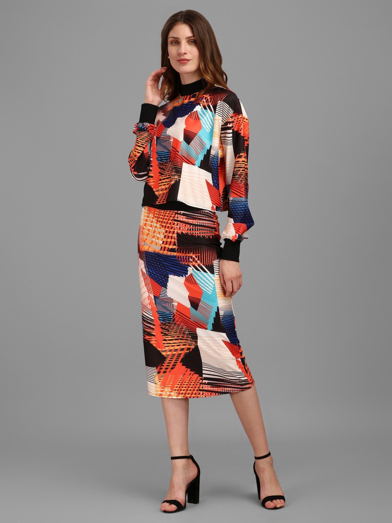 Declaim your minimalist mantras by wearing this stellar black top and skirt. Tailored with care from polyester, it features a high neck, geometric detailing, and is accented with a slip-on closure. Partner it with a pair of kitten heels and minimal makeup for a chic look.